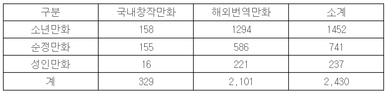2009년 우리 만화계는 비정기, 정기 간행물을 포함 총 9,390종의 만화책을 출판했다. 전체 수치상으로는 2008년 9,433건 대비 소폭 하락한 수준이다. 2000년 이후 지속 감소세였던 발행량은 지난해 소폭 상승했다가 다시 소폭 하락하는 요요 현상을 보여주고 있다. 단, 세분류별 발행현황을 검토해보면 출판만화 시장의 최근 흐름과 변화를 명확하게 반영하고 있음을 알 수 있다.