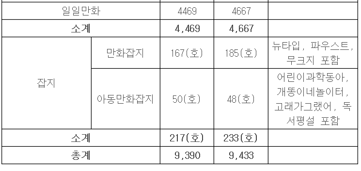 주목해야 할 지점은 지난해까지 코믹스, 도서류만화, 대본만화를 포괄한 만화단행본의 총량(2008년 기준 4,553종)보다 많은 량(2008년 기준 4,667종)을 발행했던 일일만화가 올 해는 만화단행본 총량보다 235종 적게 발행됐다는 점이다.