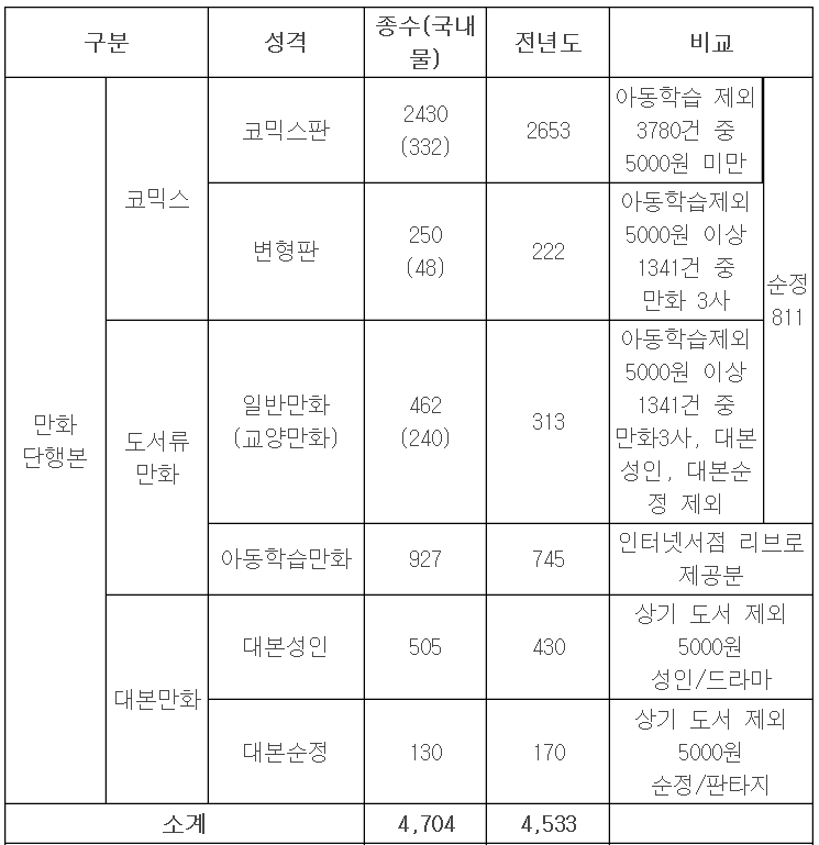 2009년 우리 만화계는 비정기, 정기 간행물을 포함 총 9,390종의 만화책을 출판했다. 전체 수치상으로는 2008년 9,433건 대비 소폭 하락한 수준이다. 2000년 이후 지속 감소세였던 발행량은 지난해 소폭 상승했다가 다시 소폭 하락하는 요요 현상을 보여주고 있다. 단, 세분류별 발행현황을 검토해보면 출판만화 시장의 최근 흐름과 변화를 명확하게 반영하고 있음을 알 수 있다.