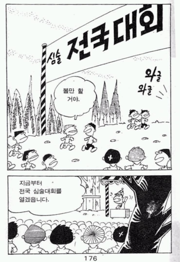 돌갑이의 심술입문과정을 지도한 심똘이 앞으로 세계심술협회에서 편지가 날아든다. 남태평양 삐삐섬에서 심술대회가 열리니 한국에서 심술대회를 열어 ‘우승하면 오라’는 초청장이었다. 이때부터 이야기는 본격적인 전개 국면을 맞이하게 된다. 한국 대표를 뽑는 서든데스 방식의 심술대회가 동네를 시작으로 전국대회로, 세계대회로 이어진다. 심술대회의 형식은 못된 짓을 한 사람의 예시를 제시하고 이 사람에게 부린 심술을 점수로 환산하여 승자를 가리는 방식이다. 스포츠극화에서나 볼 수 있는 국가대표에 대한 열망과 대전격투만화에서나 등장할법한 강자와의 대결(전국대회 서사는 <드래곤볼>의 전유물이 아니다) 그리고 모험극화에서 보여 지는 미지의 세계에 대한 동경과 도전이 펼쳐진다. 명랑만화를 밝고 환한 것이라 할 때 이 같은 설정은 ‘반명랑만화’라 할 만한 파격이다.