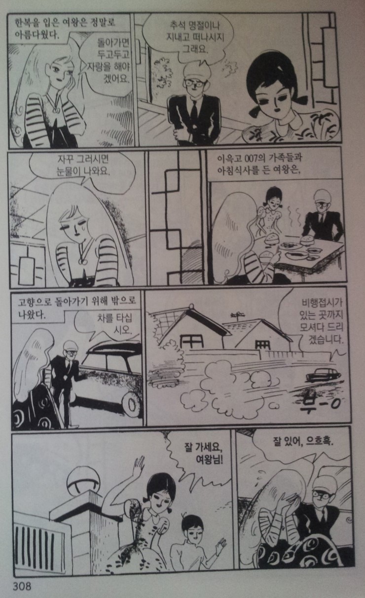 <007 우주에서 온 소년>은 한 천문학자의 말을 인용하면서 시작된다. ‘내가 지구라는 별 위에서 살고 있듯이 우주 어느 별엔가 나와 같은 지능을 지닌 생물이 살고 있을 것’이라는 단상은 김삼의 상상력을 은하계로 넓혀냈고 지구 소년 007을 우주로 보냈다. 재미있는 것은 무대는 우주선과 첨단무기가 등장하는 근미래 사회처럼 보이는데 등장인물들의 대사는 매우 구수하고 행동양식은 아주 한국적이라는 점이다. 위기에 빠진 007은 ‘호랑이에게 물려가도 정신만 차리면 산다’고 읊조리고 우주에서 온 여왕이 집에 가겠다고 하자 ‘그냥 가면 섭섭하니 하루 더 묵어’ 가라거나 ‘추석이나 지내고 가라’고 하는 식이다. 60~70년대의 행동양식이 고스란히 담겨있다.