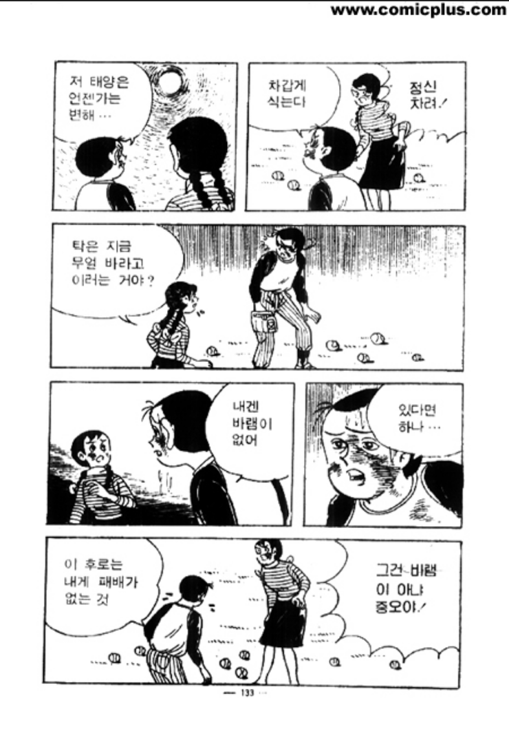 인물의 성격을 명확하게 전달하기 위한 에피소드와 화면연출 역시 당대의 많은 사람들이 이상무만화에 열광했던 이유를 알게 한다. 그 중 백미는 형에 대한 분노로 형과 같은 등번호를 달고 라이벌 구단에 입단한 독고탁이 ‘저 태양은 언젠가는 변해…차갑게 식는다’며 최고의 타자인 형도 언젠가는 패자가 될 것이라고 말하는 대목이다. 독고탁은 ‘내겐 바램이 없어. 있다면 하나… 이후로는 내게 패배가 없는 것’이라고 선언한다. 어떤 시련과 고통이 따르더라도 울지 않고 제 아무리 강자가 나타나더라도 질 수 없다고 말한다. 이 순간 한없는 증오와 복수심에 불타던 사내는 ‘자기극복의 달인 독고탁’이 된다. 우리가 사랑한 독고탁이 된다.