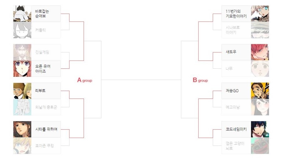 164개(165개로 출발했지만 32강에서 한 작품이 중도 하차)의 작품으로 시작됐지만 다음회를 계속 그릴 수 있었던 작품은 32 작품, 그리고 이제 16작품이 됐다.