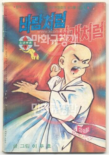 내가 처음 본 만화작품이 [소년중앙]의 만화별책부록에 연재된 <바람…>이라면 까목이는 이를 떠올리기 위한 기억의 도움 장치였을까? <유령타자>를 읽을 때 어떤 대목에서 미리 본 것 같은 느낌이 있었는데 내 기억에서 어렴풋하게 남아있는 첫 경험 만화작품이었기 때문일까? 그런데 만화작품 읽기의 첫 경험으로 떠오르는 영상 속 인물은 까까머리 스님이 아니라 검게 머리칼이 그려져 있는 것 같았다. 그 때문에 까목이가 먼저 떠오른 것 같다. 팔매일 가능성이 높은데 머리칼이 없으니…. 누굴까? 어떤 작품일까? 인터넷을 통해 한 수집가가 정리한 <바람…>을의 본문 내용을 검토하며 다시 기억을 짜냈다.