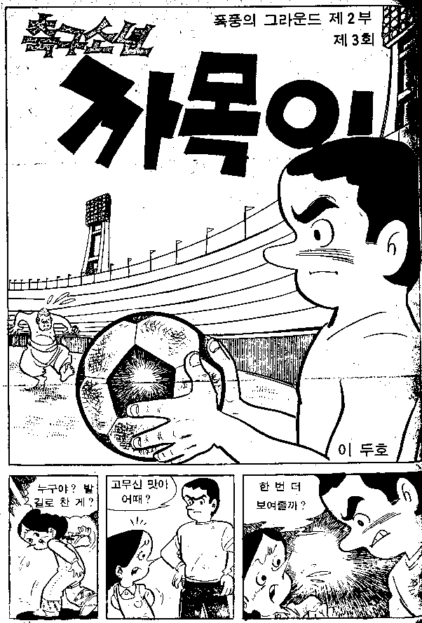 기억해야 했다. 만화평론가를 업으로 삼겠다는 자가 자신이 처음 본 만화작품과의 짜릿한 첫 경험을 기억하지 못한다면 누구에게 좋은 만화작품을 기억하고 함께 나누자 할 것 인가. ‘까먹을 것이 따로 있지….’ 혼잣말을 하다가 ‘까목’이가 떠올랐다. 목이 까맣다고 해서 까목이었다. 물론 까목이가 만화가 이두호의 초창기 캐릭터라는 것은 알고 있었다. 까목이를 스타덤에 올려 논 작품이 <폭풍의 그라운드>라는 것도 알았다.