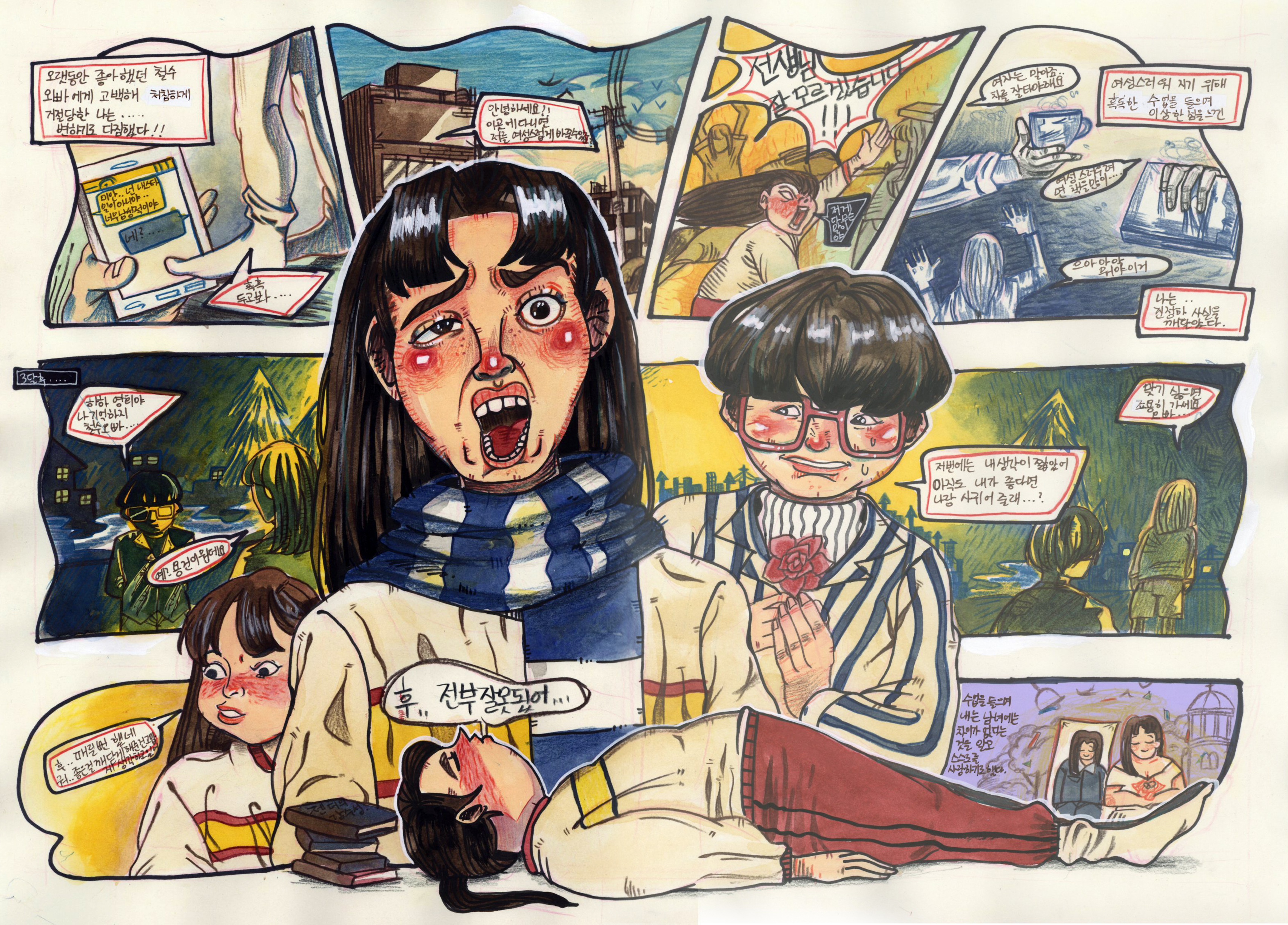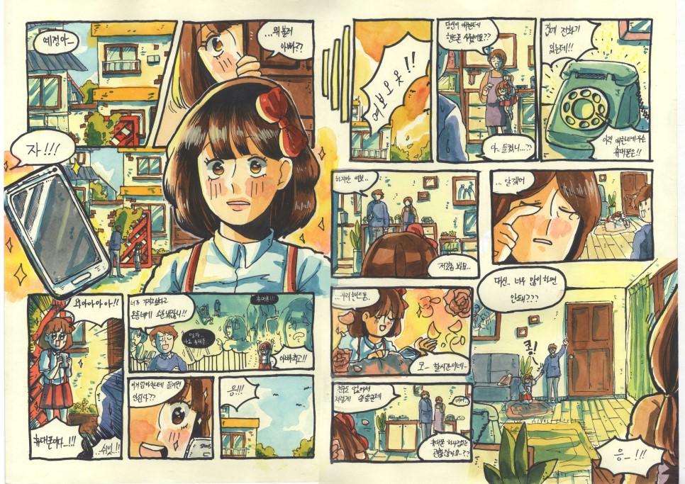 소재를 중심으로 자유롭게 상황을 구성하고 인물의 태도나 성격에 따라 사건이 전개되고 어떤 결과가 도출될 수 있도록 칸연출을 하면 됩니다.