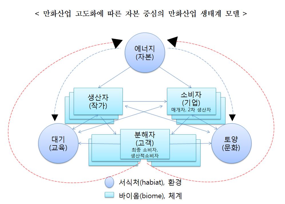 만화산업 생태계를 구성하는 주체로 ‘작가→기업→고객’이 있고 이들은 생태계 내에서 ‘생산자→소비자/매개자/2차생산자→분해자/최종소비자/생산적소비자’로서의 역할을 하고 있다.
