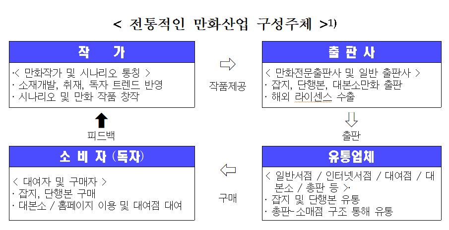 반면, 만화산업계는(학계를 포함해) ‘만화산업의 가치사슬’에 대한 논의를 전개하면서 1차 진흥계획이 정책 수요 발굴을 위해 제시한 만화산업의 4대 주체별 역할과 산업 구조 모델(작가/창작→출판사/제작→유통업체/유통→소비자/소비)을 단순 차용했다. 이는 ‘만화산업의 생태계’ 논의 과정에서도 동일하게 반복됐다.