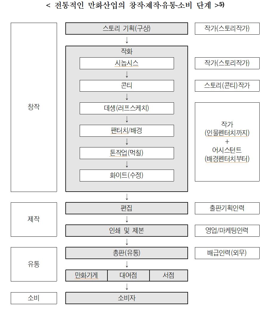 산업의 기초가 작가가 창작한 저작물과 이에 따른 저작권리에 의해 형성된 것이다. 그런데 전통적인 만화산업은 최종 상품이 책 또는 잡지 같은 인쇄․출판물의 형식을 취했다. 작품화 과정을 통해 발생한 저작물(원고, 原稿)과 저작권리에 기초하고 있지만 제품화나 상품화 단계의 과정을 통해 생산된 출판물(복제 배포물)의 유통에 의해 매출이 발생한다. 즉, 작품이 아닌 상품화 과정에 의해 가치(이윤)가 창출되고 배분됐다. 이에 따라 전방에서 작품화를 전담한 작가의 권리보다 후방에서 상품화를 위해 비용을 투자하고 이를 회수한 기업의 권리가 더 큰 구조를 취했다. 이 중심에 제품화를 전담한 생산기업(출판사나 매체사)이 있었다. 그래서 그간의 만화산업은 저작권리 유통 사업에 입각해 있다기보다는 출판물유통업 또는 제조업의 기준에 맞춰져 있었다. 하지만 최근 만화산업의 핵심 상품이 책이나 잡지 같은 물리적 상품이 아닌 디지털화 된 비물리적 상품으로 전환되면서 산업의 주축을 형성하고 있던 생산기업의 역할에 변화가 발생하고 있다. 이른바 한국형 디지털만화라고 하는 ‘웹툰’이 국내만화산업의 주류 장르가 되면서 만화산업 내에서 작가와 기업, 생산기업과 유통기업 간의 역할과 권리 분배 과정에서 혼란과 분쟁이 발생했다.