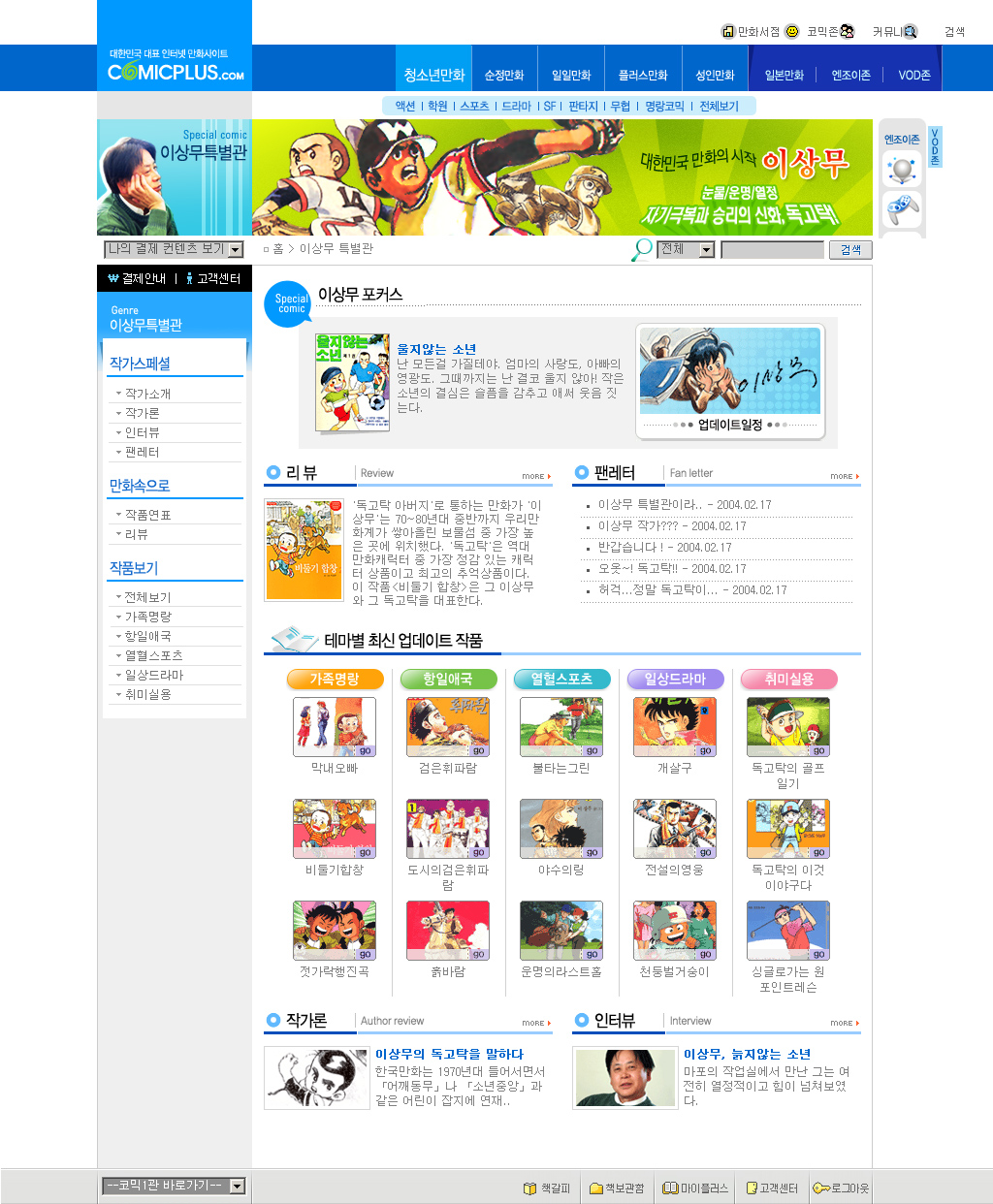 비슷한 것이 하나있기는 하다. 2000년 초 만화포털사이트 코믹플러스를 오픈하고 일정 수준의 성과를 내고 있을 무렵 이상무 선생님의 작품을 디지털로 복원해 ‘이상무 특별관(관련보도 ; 전자신문, 2004. 2. 24)’을 개설했었다. 내 소년기를 형성했던 이상무의 만화가 지금 세대들에게도 유의미한 성찰과 영감의 기회를 제공할 것이라 믿었다.