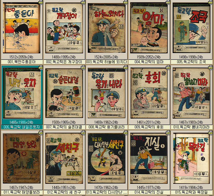 문제는 스캐닝과 이미지 보정 과정이었다. 종이의 원료인 셀롤로오스는 습한 공간에 있으면 물기에 반응하면서 앞장과 뒷장을 달라붙게 만든다. 달라붙은 장을 인쇄면의 훼손 없이 때어내는 작업은 어찌 보면 복불복게임과도 같았다. 그렇게 사라진 인쇄면을 복원시키는 일은 적지 않은 노동을 요구했다. 종이에 인쇄를 할 때는 잉크 번짐을 막기 위해 산성충전물을 주입한다. 그런데 이 물질은 시간이 경과되면 종이를 누렇게 변색되게 만든다. 보통은 스캔한 후 표준 조정 값을 입력해 스캔 이미지의 감도를 통일하는데 이번 경우는 그렇게 할 수도 없었다. 변색의 정도가 각 책별로 편차가 있어서 책별로 개별 값을 지정해줘야 했다. 사라진 글자를 찾는 일도, 일부가 잘린 페이지를 찾는 일도 간단치 않았다. 그저 가능한 모든 방식을 동원해 사과상자 속에 누워있는 책을 컴퓨터 모니터 속에 세워 달라!’고만 했다. 그렇게 이상무 만화 전작 디지털화 프로젝트가 진행됐다. 우왕좌왕 하던 일들이 하나둘 체계를 갖추게 되면서 목표했던 작품목록이 이미지 데이터로 서버에 쌓였다. 당시 이 일을 함께 했던 이호석, 김종필, 이대연, 최호필 등 동료직원들의 이해와 헌신이 있었기에 가능한 일이었다. 물론, 이상무 만화와 독고탁 콘텐츠에 담긴 정서와 가치가 그들을 움직인 힘이었을 것이다.