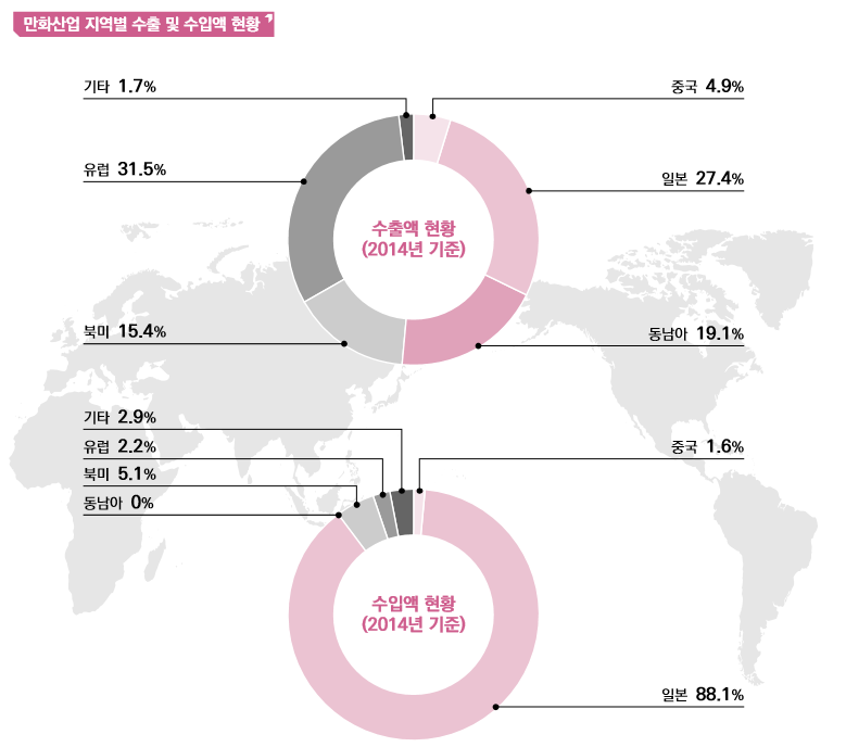2010년 이전 일본 망가 수입액은 5백만 달러 수준이었다. 올 해는 더 증가 할 전망이다. 아이러니하게도 일본 망가 수입액의 증가 역시 웹툰 시장의 활성화가 주 요인이다. 웹툰 활성으로 만화 전반의 소비 규모가 늘면서 감소했던 수입 일본 망가의 소비도 점진적으로 증가한 것이다. 이 뿐만이 아니다. 일본 망가 수입에 비할 바는 아니고 국내 수출량 대비 낮은 수치지만 미국산 히어로 코믹이나 유럽산 방드데시네에 대한 수입량도 큰 폭의 증가세를 보이고 있다. 국내 만화 소비의 다양성을 증진시킨다는 측면에서 반가운 일이다. 또, 웹툰의 세계진출이 일방적인 것이 아니라 상호적 측면에서 전개되고 있다는 점에서 바람직한 방향일 수 있다. 하지만 이 역시 전략적 고민이 필요하다. 시장 논리에서만 본다면 수입량이 증가하는 것은 국내 생산이 소비 규모를 따르지 못하는 경우나 수입 유통을 통해 얻는 수익이 국내 생산을 통해 얻는 수익보다 높은 경우이다.