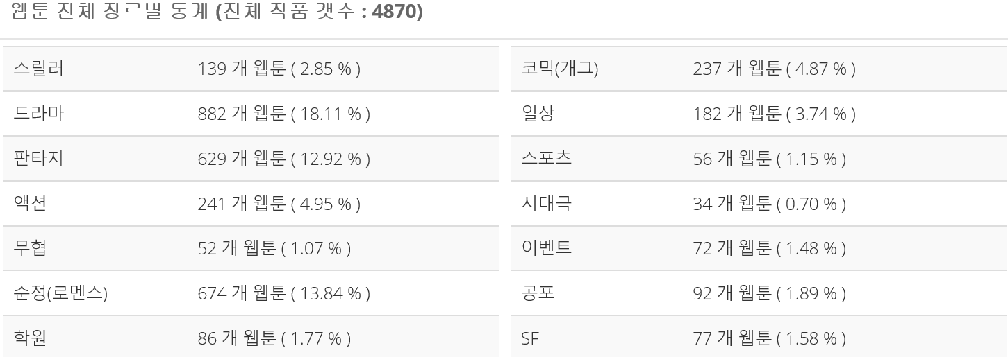 웹툰 정보사이트 웹툰인사이트의 웹툰 장르별 통계(2016.7기준)에 의하면 현재 서비스되고 있는 웹툰의 총 수는 4,870편이다. 3,354편(68.87%)이 연재 중에 있고 18세 이상 구독 가능 작품은 704편(14.46%)이다. 이중 드라마 장르가 882편(18.11%), 순정로맨스 장르가 674편(13.84%), 판타지 장르가 629편(12.92%)이다. 분류기준이 된 14개 장르 중 3개 장르의 총 합이 44.87%나 된다.