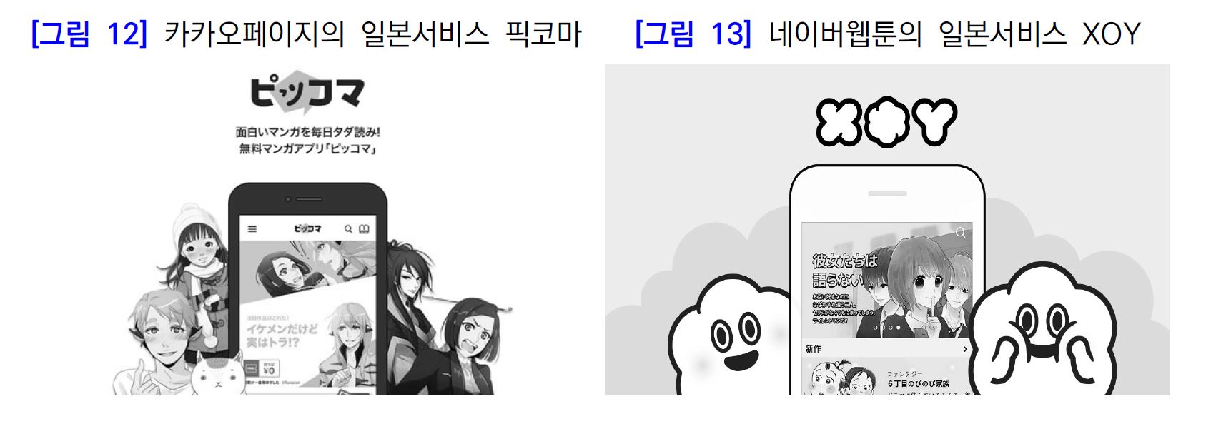네이버웹툰은 라인웹툰 및 XOY를 통해 해외 콘텐츠 제작 및 유통을 직접 추진하는 반면, 카카오페이지(다음웹툰컴퍼니 포함)는 픽코마를 중심으로 일본 서비스는 직접 추진하고 영미권, 중화권 등에는 해외 전문플랫폼과의 협력을 통해 진출
