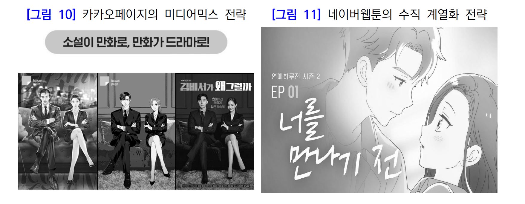 ※ 네이버웹툰이 작가들과 직접 계약해 콘텐츠를 독점 서비스했다면 카카오페이지는 설립 초기부터 웹툰기획개발사나 제작사를 통해 독점/비독점으로 양질의 콘텐츠를 확보하는 방식을 취함. 선고료를 지급하는 방식으로 우수 제작사를 유입시키고 유통 경쟁력에만 집중(양질의 기획개발사나 제작사가 선호). 네이버웹툰의 콘텐츠 유입 정책 변화와 시리즈 개편은 카카오페이지를 의식한 것이라 평가
