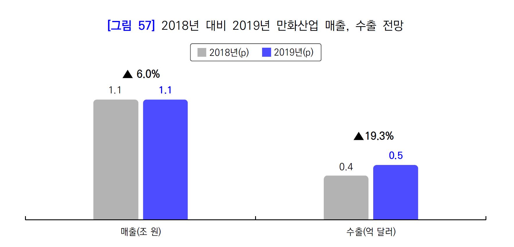 ○ ’19년 국내 만화산업 매출액은 ’18년 대비 6.0% 증가한 1.1조 원, 수출은 19.3%