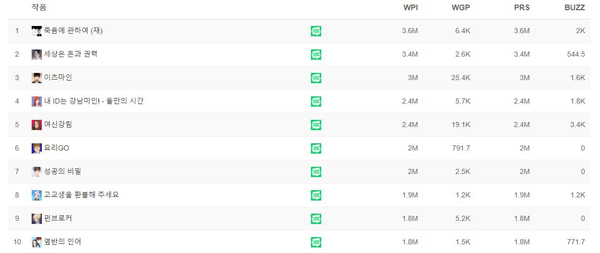 작품 관련 흥미 있는 데이터는 6개월 미만의 신작을 중심으로 한 순위이다. 10위권 내 전 작품이 네이버웹툰 연재작이다. 재연재를 시작한 <죽음에관하여>가 1위를 차지했고 유명 에이전시 기획 작품으로 공개된 <세상은 돈과 권력>(와이랩), <이츠마인>(와이제이코믹스)이 2, 3위를 차지했다. TV드라마로 방영되고 있는 <내 ID는 강남미인>의 외전격인 ‘둘만의 시간’편은 4위에 올랐다. 네이버웹툰 게재작을 제외한 신작 순위에서는 <사랑은 환상> <말랑한 그이> <소녀모르모트>(이상 레진코믹스), <내로남불> <발기찬처가생활>(이상 투믹스) 등의 작품이 올랐다.
