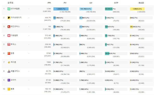 플랫폼별 페이지뷰 기준 순위는 네이버웹툰이 점유율 64.7%(11억6천4백만 뷰)로 압도적 1위를 차지하고 있다. 카카오페이지가 9.8%, 레진코믹스가 8.7%, 다음웹툰이 5.2%로 1위와 차이가 큰 중위그룹을 형성하고 있다. 투믹스, 탑툰이 2% 대, 케이툰, 배틀코믹스고 1% 대, 코미카, 봄툰이 0.7%~0.6% 대 점유율로 10위권에 들어와 있다.