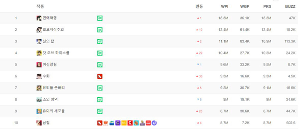 네이버웹툰의 대표적 인기작품인 <연애혁명>, <외모지상주의>, <신의탑>, <갓오브하이스쿨>이 상위권에 랭크됐다. 7월 현 16화가 게재된 <여신강림>이 5위에 랭크됐다. 레진코믹스의 <수화>가 전 달에 비해 36계단 상승하며 6위를 차지했다. 복수의 사이트에 유통되고 있는 <남첩>도 오랜 기간 10위권에 머물고 있는 작품이다. 네이버 웹툰을 제외한 작품 순위에서는 <사랑은 환상!> <순결한 죄> <BJ알렉스>가 3~5위를 차지했다.