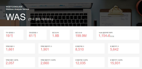 2018년 6월, 웹툰가이드는 WAS를 통해 한국 웹툰 시장 현황을 집계하고 분석한 결과를 탑재했다. 2018년 6월 기준 전체 플랫폼은 61개, 월간 총 페이지 뷰는 18억 건, 월간 총 방문자 수는 1억9천9백만 명이다. 연재 중인 웹툰 수는 1,661편(작가 1,901명), 누적 총 웹툰 작품 수는 8,510편(작가 5,642명)이다.