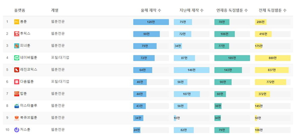 가장 많은 신작을 등록한 플랫폼은 봄툰으로 120편(지난해 75편)이었다. 2위는 투믹스로 90편(지난해 72편), 3위는 피너툰으로 79편(지난해 34편)을 등록했다. 상위 3개 업체는 상반기 등록 작품 수가 지난 한 해 등록한 작품 수를 이미 넘어섰다. 신규 운영 동력을 확보했거나 도전적으로 운영력을 강화하고 있는 것으로 보인다.